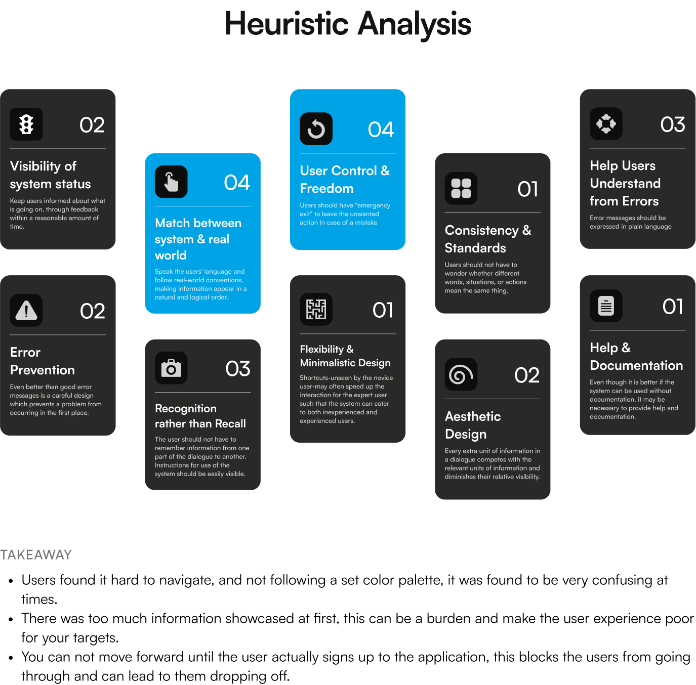 For example, User Control & Freedom allows for easy navigation and exit points in a process. Signing up is required to move forward, but users can still exit midway. However, due to limited control and freedom, the principle only scored 1 out of 4.