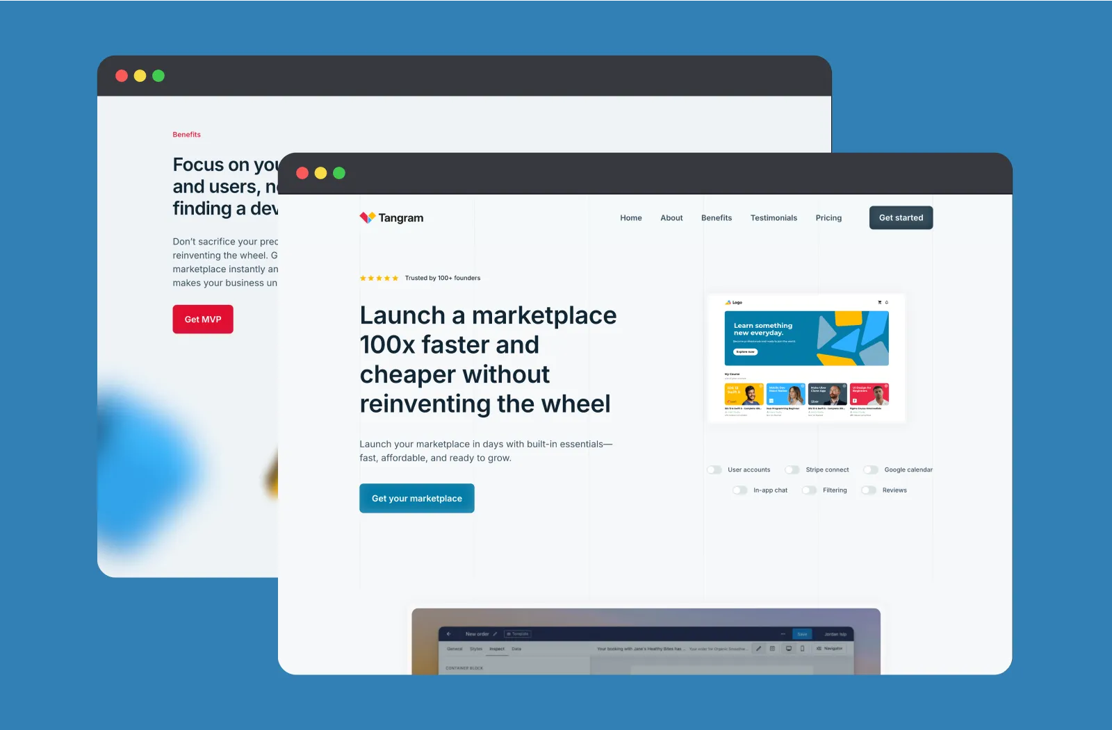 Tangram is a platform that enables rapid development of online marketplaces using Webflow, offering a cost-effective alternative to custom development. They provide a 7-day development timeline with a 30-day money-back guarantee.